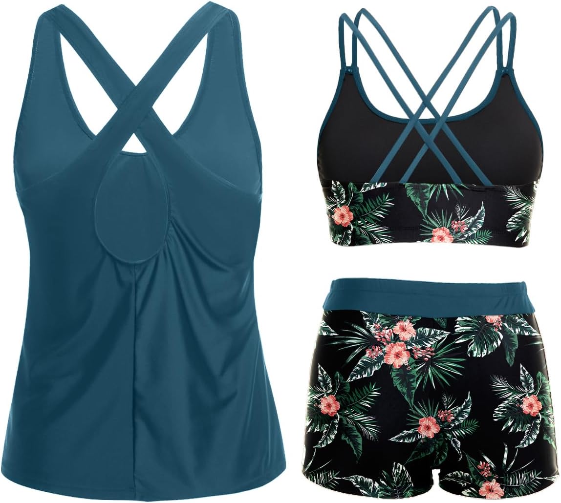 Holipick 3 Piece Tankini Swimsuits for Women Tummy Control Bathing Suits Swim Tank Top with Bra Boy Shorts Teen Swimwear